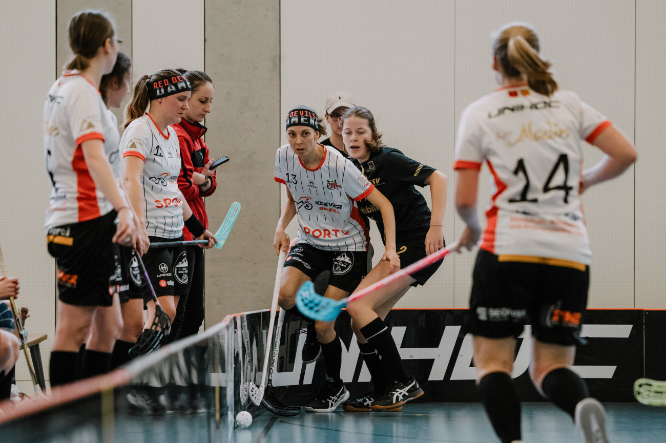 Auf das erste Spiel an diesem Sonntag hat sich das Damen 2 besonders gefreut und auch vorbereitet. Trainer Mäni Berzel hat sogar über die Weihnachtsfeiertage zwei Trainingseinheiten organisiert, die beide sehr gut besucht waren. Das Team war also bereit den Tabellenführerinnen ein Bein zu stellen. Die Teufelinnen starteten konzentriert ins Spiel. Die Vorgaben des Coaching-Staff wurden gut umgesetzt und den Gegnerinnen wurde kaum Raum gelassen ihr Spiel zu lancieren. Wenn den Falcons mal ein Abschluss aufs Tor gelang, war Halter im Tor der Devils bereit. Selbst erspielten sich die Teufelinnen einige gute Torchancen, die aber allesamt von der hervorragend aufspielenden Torfrau der Falcons zunichtegemacht wurden. In der 13. Spielminute konnte eine Spielerin der Falcons gleich zweimal allein auf Halter losziehen, kratzte diese den ersten Versuch noch mirakulös aus der Luft war sie beim zweiten Abschluss machtlos und so ging es mit einem 0:1-Rückstand in die Pause. Kurz nach Wiederanpfiff gelang Fischer der verdiente Ausgleich für die Devils. Das Spiel war auch in der zweiten Halbzeit ausgeglichen, aber es waren wieder die Falcons, die ihre Torchancen ausnutzen und bis zur 29. Spielminute mit 1:3 in Führung gehen konnten. Die Teufelinnen versuchten nochmals alles, dieses Spiel doch noch zu gewinnen. Aber die Kräfte liessen langsam nach und die Zeit wurde zunehmend knapp. Der Anschlusstreffer durch Martina Müller in der 40. Minute kam leider zu spät. Auch mit 4 Feldspielerinnen in den letzten Sekunden konnte der Ausgleich nicht mehr erzielt werden. Somit gingen die Teufelinnen trotz sehr guter Leistung im ersten Spiel leer aus.