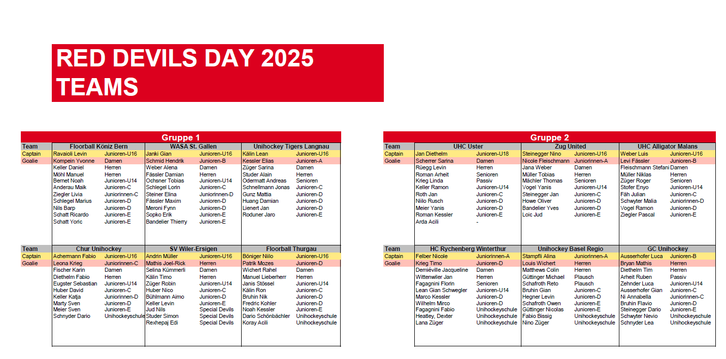 In 12 bunt gemischte Teams hatten die Organisatoren die über 120 Teilnehmenden aus dem ganzen Vereinsspektrum – von der Unihockeyschülerin bis zum 1. Liga-Spieler – eingeteilt. Und angesichts der gleichlautenden Anzahl hatte es sich angeboten, die Mannschaften nach den Clubs aus der höchsten Unihockeyliga zu benennen. So kam es schon in der Gruppenphase zu spannenden Duellen zwischen nationalen Grössen: Etwa Wiler-Ersigen gegen Floorball Köniz oder GC Unihockey gegen Alligator Malans.